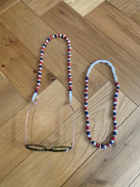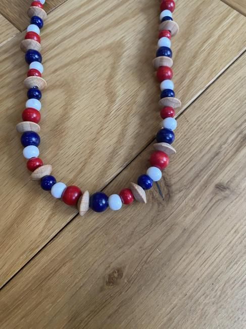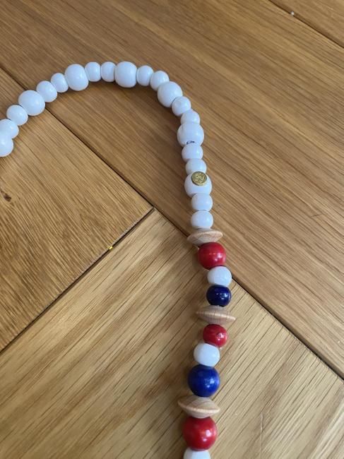 今シーズンは赤、白、青のトリコロールと円盤の様なナチュラルカラーのビーズ。